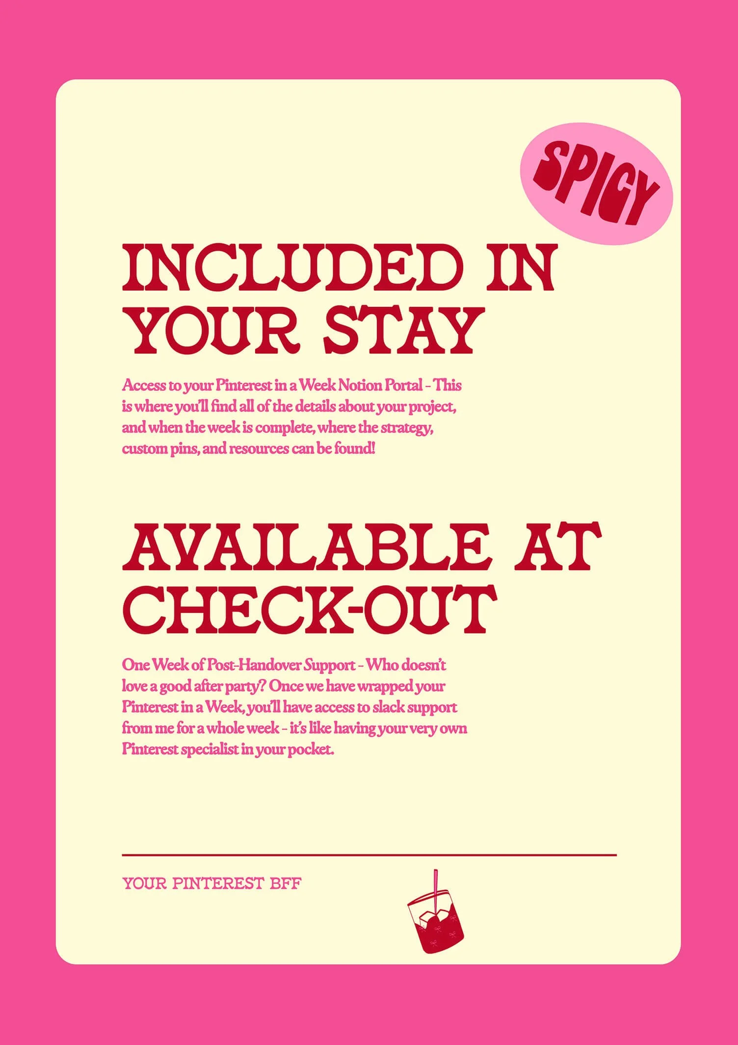 I’m the type of person to extend my vacation by a day or two because I’m just enjoying myself that much, and I kept that in mind when I created this service! I offer an additional week of support via Slack to help you implement the strategy and address any questions. For ongoing support, you can also opt for my monthly Pinterest management services.