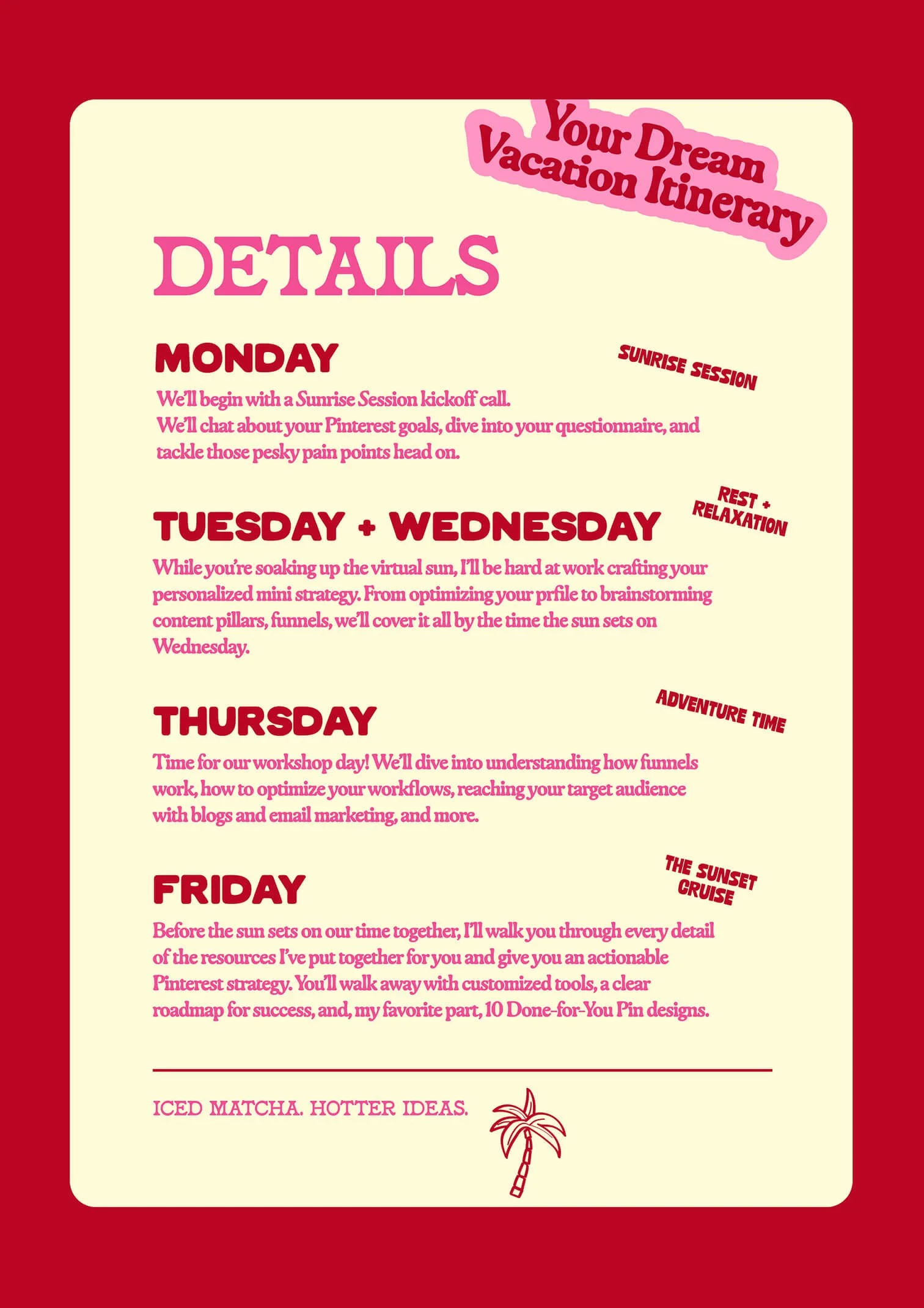 Like a lasting tan, you’ll leave with the know-how to keep your Pinterest momentum going long after the week ends. And the cherry on top? Slack support from me, your marketing sidekick, for a whole week after your project wraps up.